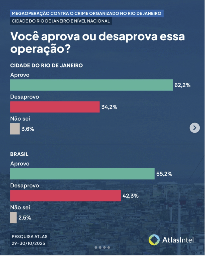 A pesquisa Atlas divulgada nesta sexta-feira (31) sobre a megaoperação da Polícia Militar realizada no Rio Janeiro na terça-feira passada (28), contra o crime organizado, é reveladora de uma face assustadora e até então desconhecida da sociedade brasileira.
