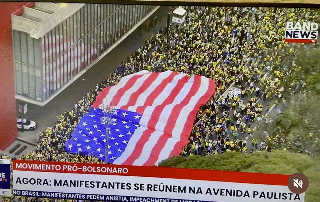 A direita e a extrema direita tomaram a avenida Paulista, em São Paulo, neste domingo (7) para protestar contra o Supremo Tribunal Federal (STF) e pedir anistia para golpistas do 8 de janeiro de 2023. O principal destaque da manifestação, além das narrativas nonsenses, foi uma bandeira gigantesca dos Estados Unidos, que eles fizeram questão de levar para o ato.